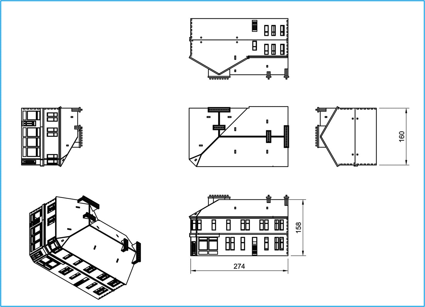 This kit is for a CORNER tenement. It can be used with the PopUp Lanarkshire Tenement kit to add to a row of tenement buildings. This Lanarkshire tenement kit represents a basic tenement (without the bay windows that signified more affluent areas). It represents a building that can be found in many of the towns across West Central Scotland. The kit comes as a 3-storey building (to which an optional “extra storey” kit can be added) but can readily be assembled as both 3 and 2 storeys. The frontage has options for the windows and embellishments to the lintels. These options are highlighted on the next page. There are a pub and shop on the ground floor. (Use an opaque backing for the pub windows.)