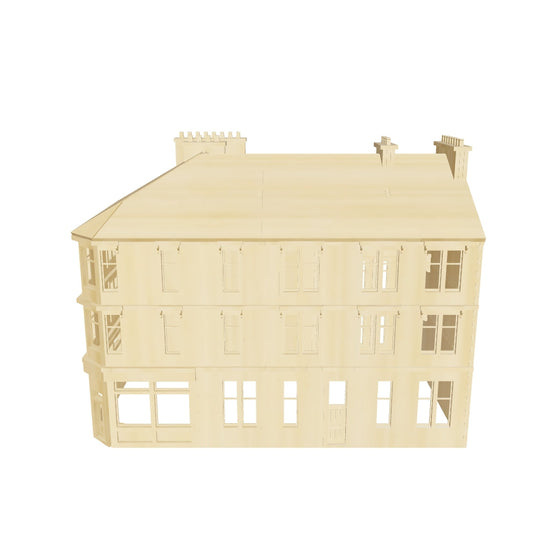 This bespoke 6 x A4 laser cut 3mm plywood sheet (2x0.8mm) model has been designed in 1/76 scale to represent a style of tenement building found across West Central Scotland. (The “Extra Storey” kit - sold separately is 2 x A4 3mm ply sheets and 1 x 0.8mm sheet.)